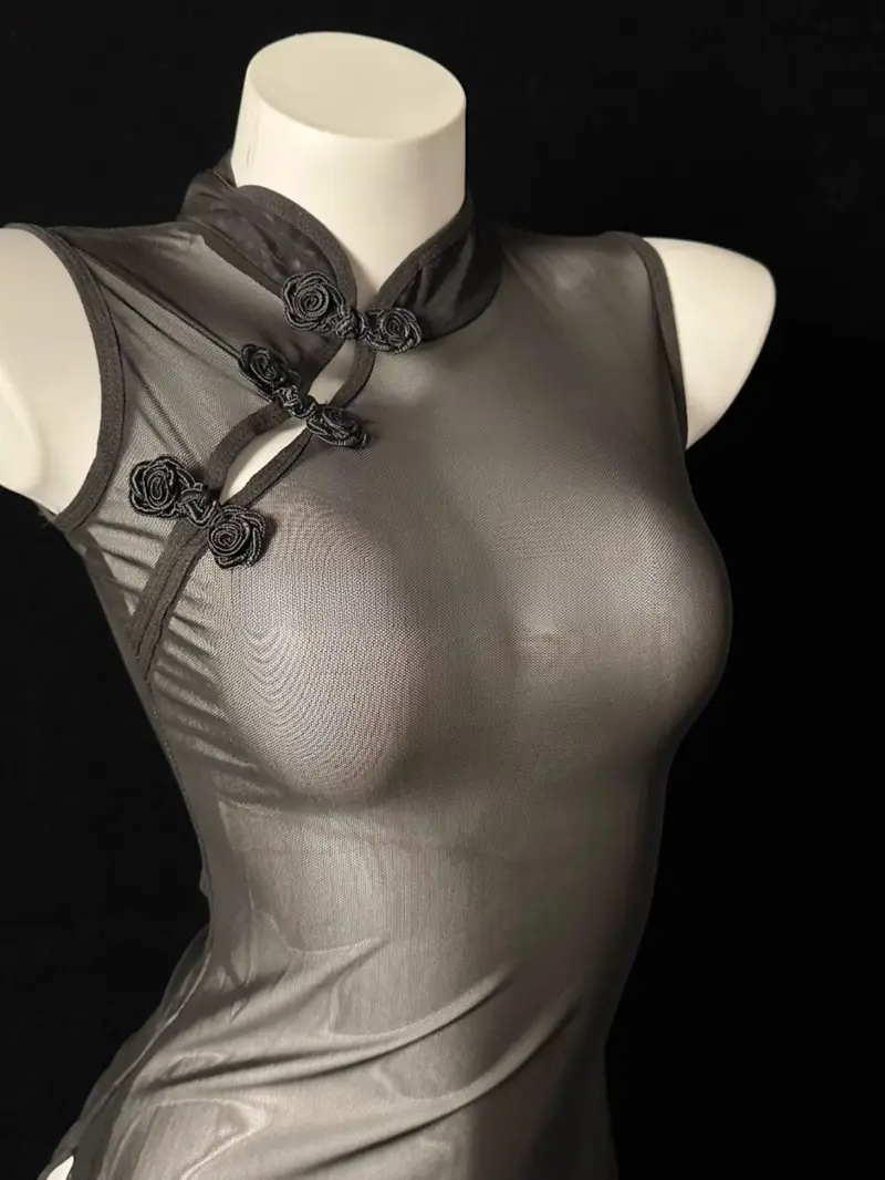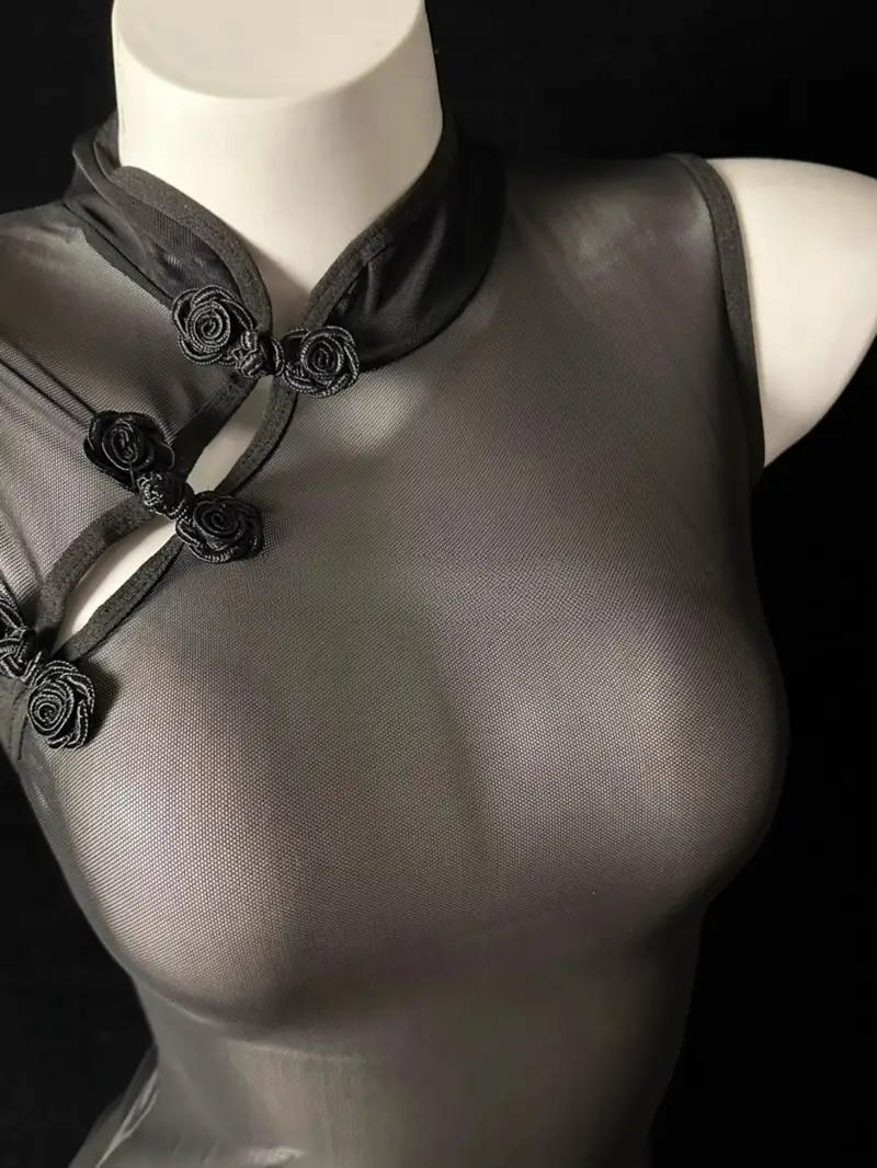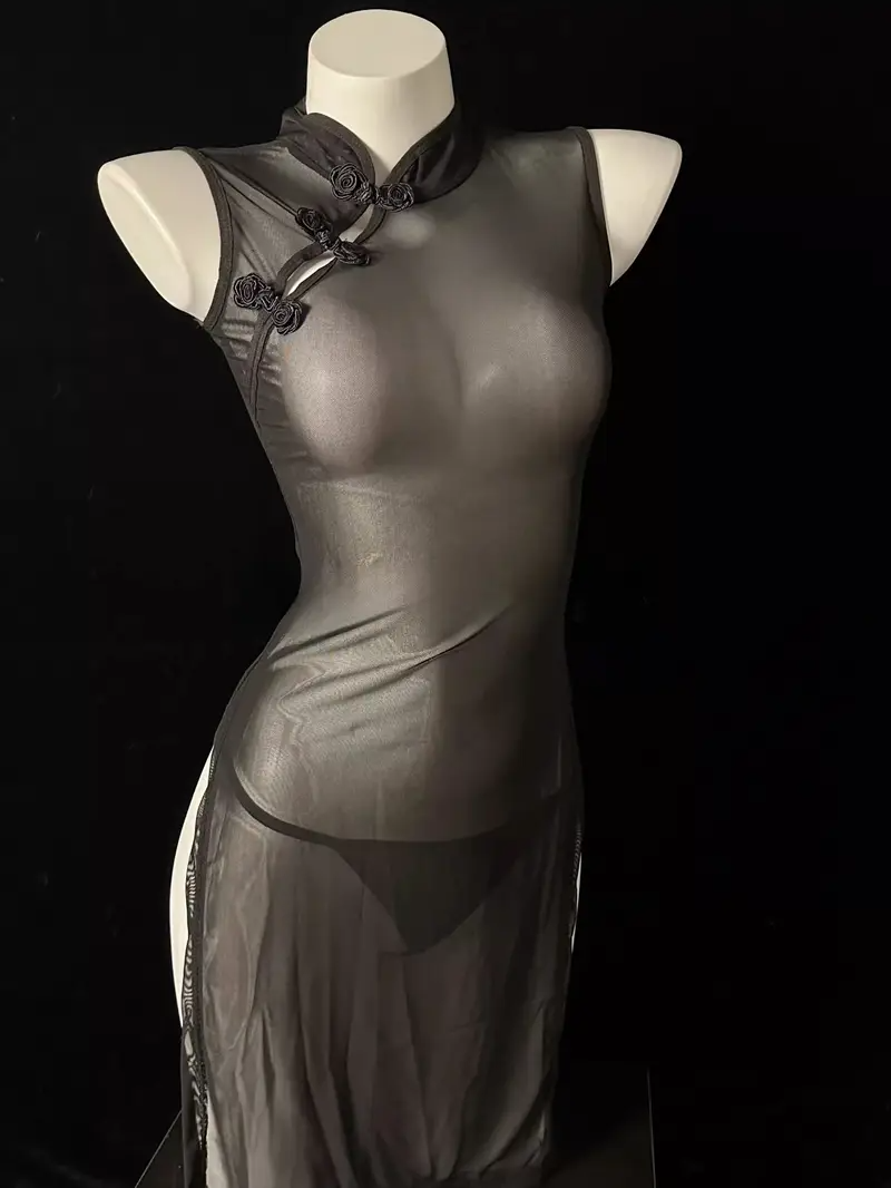 Sexy High-Slit Cheongsam Tulle Nightgown with Thong