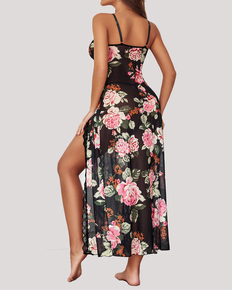 Sexy Suspenders See-Through Lace Mesh Long Slits With Panties Pajamas Set